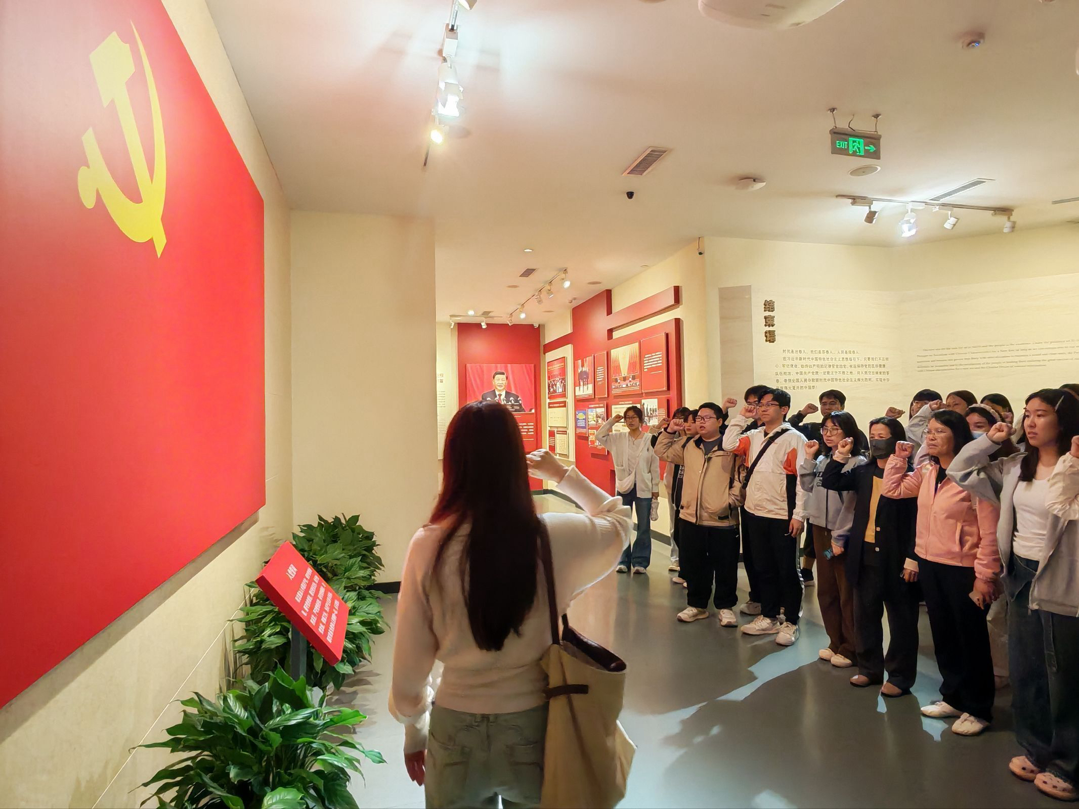 随后,师生们走进中共五大会址纪念馆,参观《紧急时期的艰难探索——中共五大历史陈列》展区。大家深入了解了1927年大革命危急关头,中共五大的召开背景、会议历程及其历史贡献,真切感悟到党在紧急关头的艰难探索与使命担当。在复原的中共五大开幕会会场中,师生们沉浸式回望革命先辈的奋斗足迹,深刻体会那段岁月的艰辛与不易。在展厅内的誓词牌前,全体党员面向党旗庄严举起右拳,集体重温入党誓词。铿锵有力的誓言在展厅中久久回荡,进一步坚定了大家为党奋斗终身的初心与使命。
