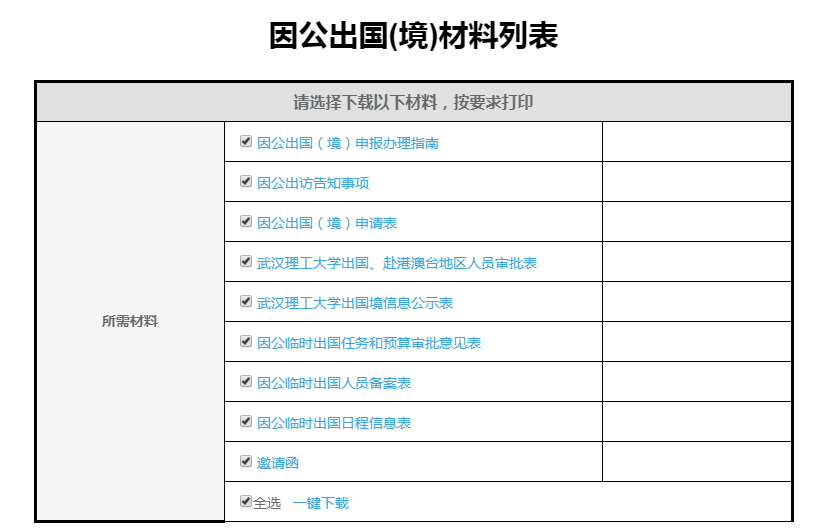 4.申请人可通过智慧理工大查看审批进度,审批完成后,批量下载因公临时出国(境)申请材料(只有网上审批完成后,系统中的因公出国材料才是齐全的),按《因公出国(境)申报办理指南》说明,到相关部门盖章。