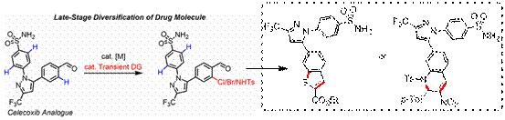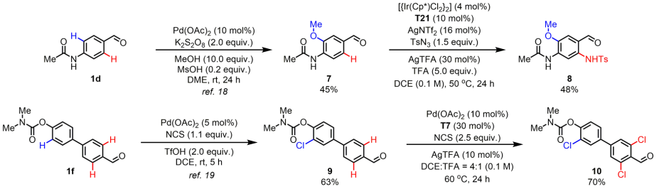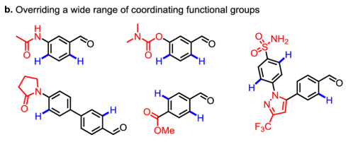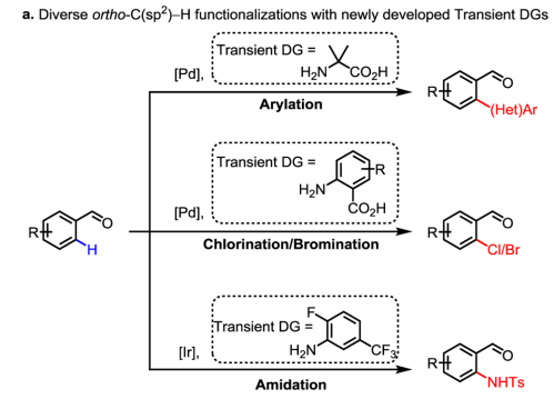 课题组近期采用催化量氨基酸和苯胺衍生物分别作用底物苯甲醛,通过动态可逆形成的亚胺中间体引导过渡金属钯、铱催化剂精准识别惰性碳氢键,实现了苯甲醛的邻位碳氢键活化芳基化、氯化、溴化及氨基化反应。此外,研究还发现常见的导向基,如酯基、氰基、酰胺基、乙酰基,甲砜基、二甲胺甲酰氧基等不影响此反应体系的位置选择性。