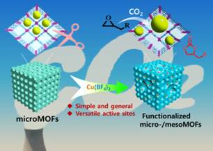 常刚刚博士提出一种利用竞争性配位同步实现多功能、多级孔MOFs材料构建的新策略。本方法巧妙的利用四氟硼酸盐(M(BF4)x, 其中M为金属位点)在不牺牲结构稳定性的情况下,在微孔MOFs材料中同步实现缺陷介孔和功能化,在CO2的环氧化加成制备高附加值产品中展现出优异的催化性能。此外,本工作还通过第一性原理计算方法阐明了其缺陷介孔的形成机理,并且该方法在其它类型的MOFs材料中也具有一定的普适性,为功能化多级孔MOFs材料的构建提供了一种新的思路!