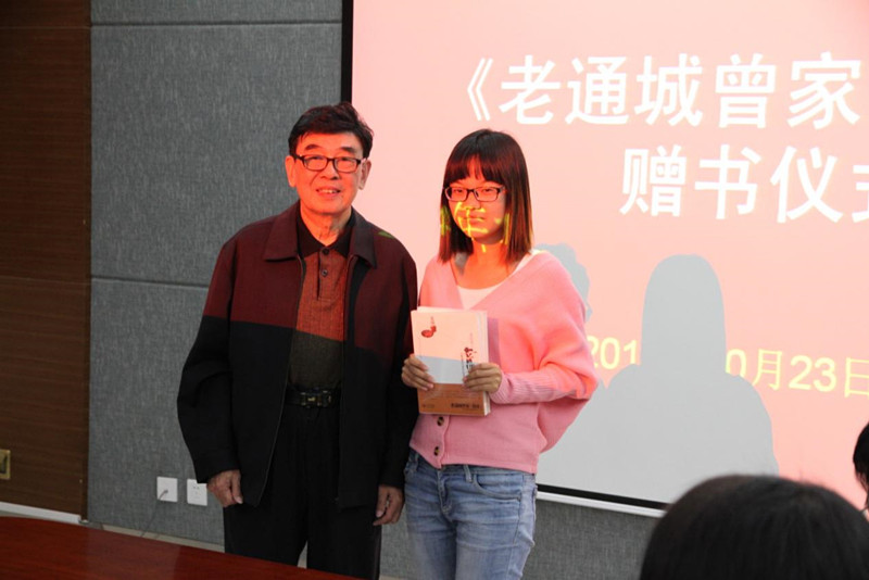 报告结束后,曾宪德校友将自己创作的长篇小说——《老通城曾家·创业》分别捐赠给两个支部和成人在线 图书馆,并祝愿母校有更好的发展。学生代表为先生送上了鲜花,祝福老校友健康长寿。