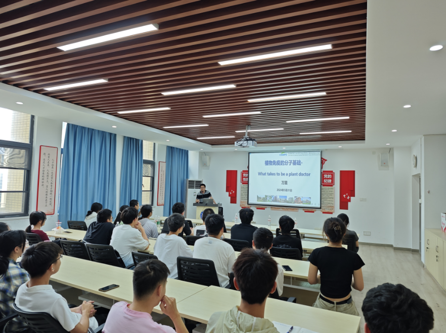 万里博士首先介绍了植物保护背景下的对植物免疫研究的重要性以及自己课题组对该方向的研究方法,随后介绍了植物的免疫系统识别病原微生物并激活免疫反应的过程,病原微生物对该免疫过程的应对机制,植物为应对病原微生物发生的此类变化,产生NLR细胞内免疫受体来防止病原体的扩散,同时简要介绍了NLR蛋白的结构与功能,丰富的讲座内容使同学们对于植物的免疫机理有了更加深入的了解。